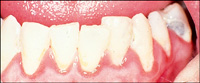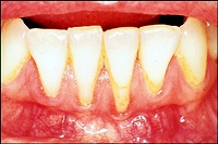 The mildest form of the disease is called gingivitis (see photo at right). The gums redden, swell and bleed easily. Gingivitis is often linked to inadequate oral hygiene. Gingivitis is often reversible with professional treatment and good oral home care.